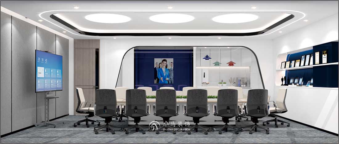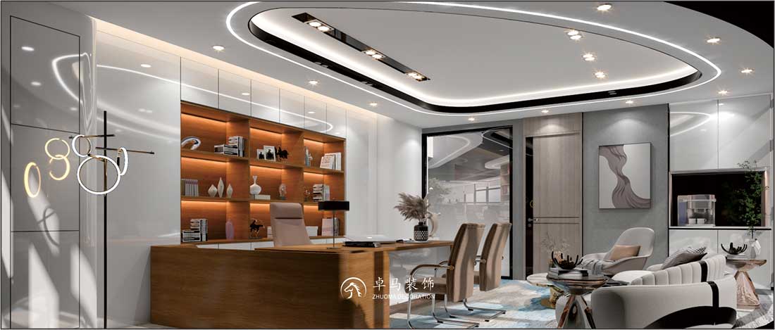 空间以浅灰碳晶板为基调,沉稳中透着克制,红木色办公家具点缀其间,在简约线条中透出东方雅韵。灰蓝交织的地毯如淡墨远山,增添一份诗意。天花以弧形线条勾勒立体层次,黑色不锈钢饰条与灯带交汇,科技感与艺术感并存。线性灯光与悬浮点光源洒落柔和光晕,平衡高效决策与静谧心境,营造兼具现代商务逻辑与传统底蕴的理想空间。